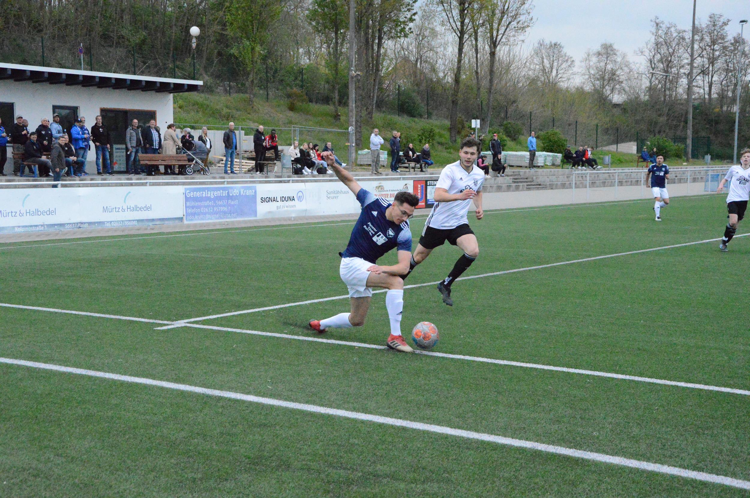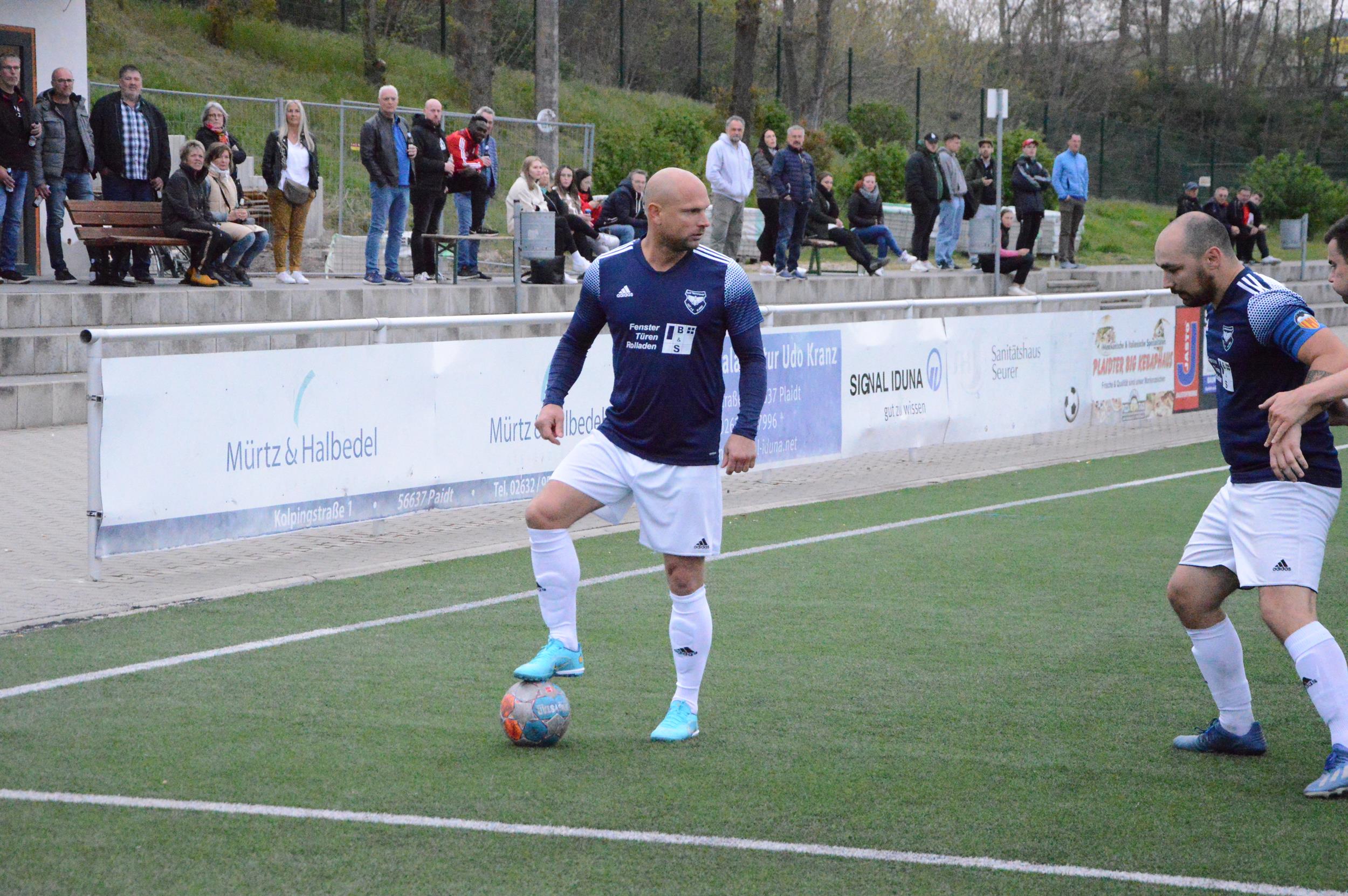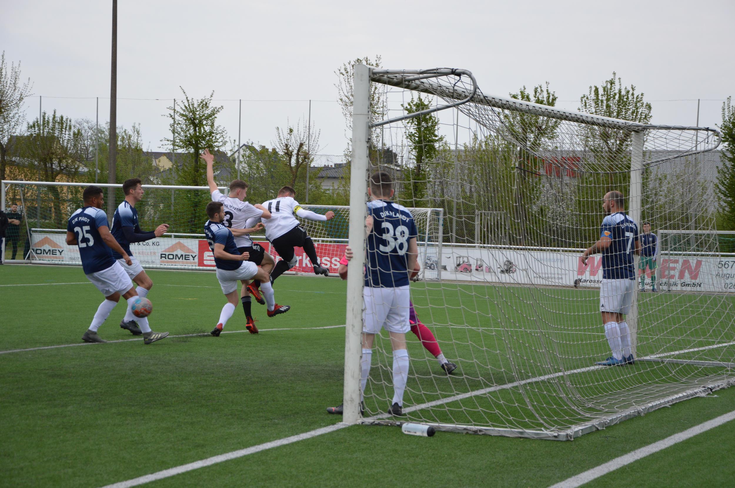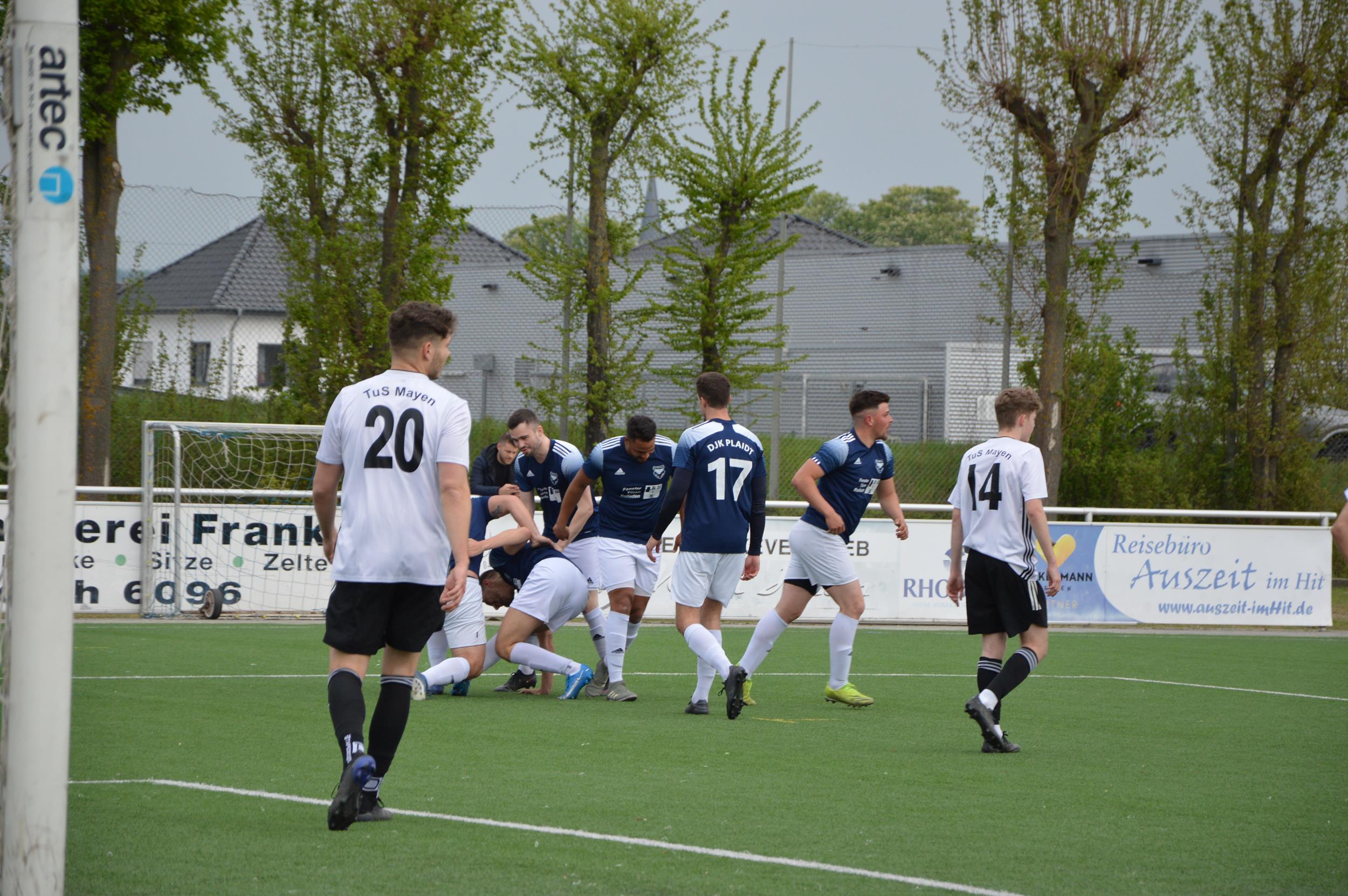 Einen perfekten Start erwischte die erste Fußballmannschaft der DJK Plaidt im Spitzenspiel gegen TuS Mayen II am heimischen Pommerhof. Nach vier Spielminuten landete ein langer Einwurf von Spielführer Simon Schmitt bei Oliver Pung, welcher die Kugel aus kurzer Distanz über die Linie drückte. Kurz darauf gelang Schmitt die nächste Torvorlage. Sein Eckball köpfte Lukas Schlimper unhaltbar zum 2:0 ein (11.). Anschließend hatten die Gäste ein optisches Übergewicht, kamen jedoch nur zu einem gefährlichen Torversuch. Einen Heber parierte Plaidts Keeper Dominik Klein herausragend im eins gegen eins. Die Hausherren hätten in Form von Martin Paffhausen schon vor der Pause den Sack zumachen können, doch der schnelle Angreifer hatte an diesem Tag Fortuna nicht auf seiner Seite.